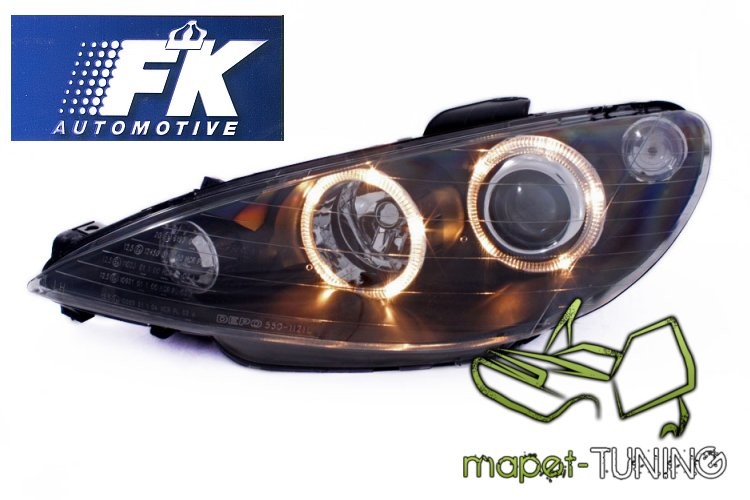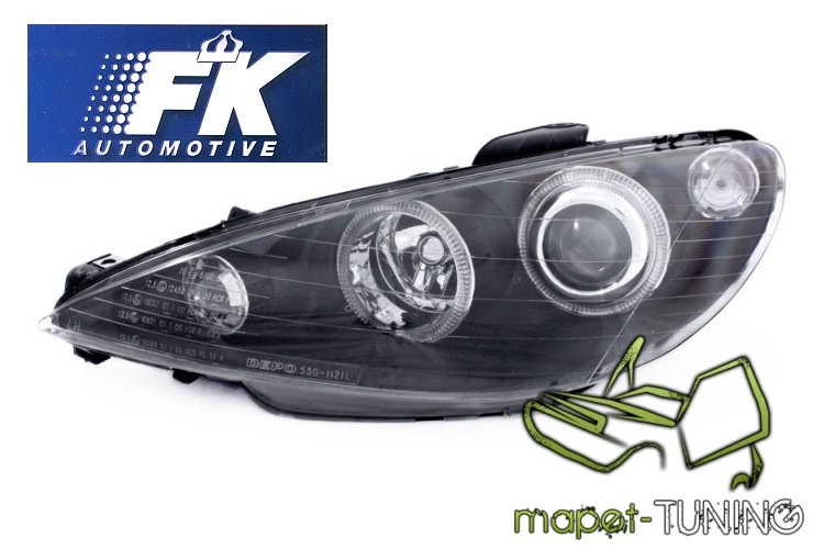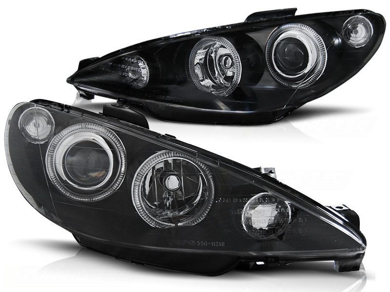 Lampy przednie do: Peugeot 206 - Angel Eyes BLACK - Ringi - przezroczyste z ciemnym wkładem i soczewką + 2 ringi + kierunkowskaz