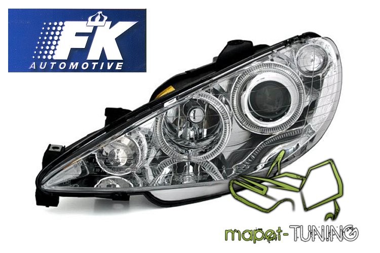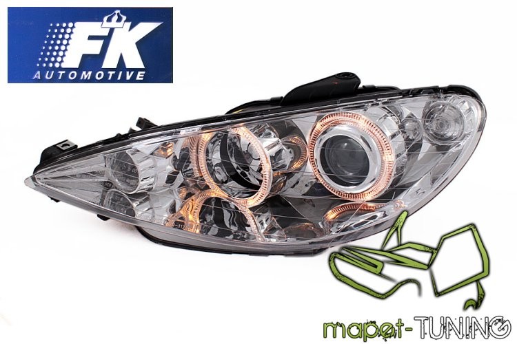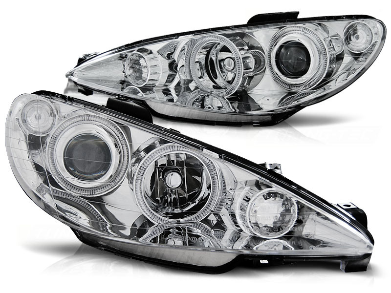Lampy przednie do: Peugeot 206 - Angel Eyes CHROM - Ringi - przezroczyste z soczewką + 2 ringi + kierunkowskaz