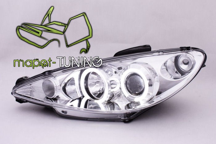 Lampy przednie do: Peugeot 206 - Angel Eyes Chrom - Ringi - przezroczyste z soczewką + 2 ringi + kierunkowskaz