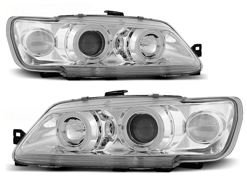 Lampy przednie do: Peugeot 306 - Angel Eyes CHROM - przezroczyste z soczewką + Ringi