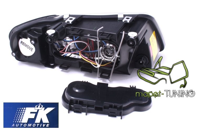 Nowoczesne przezroczyste reflektory typu Clear BLACK znanego producenta oświetlenia samochodowego. Posiadają soczewki i 2 świecące ringi.