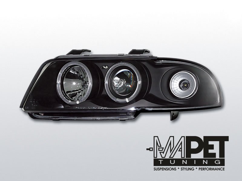 Lampy przednie do: Audi A4 B5 - RINGI BLACK - przezroczyste czarne soczewkowe + ringi