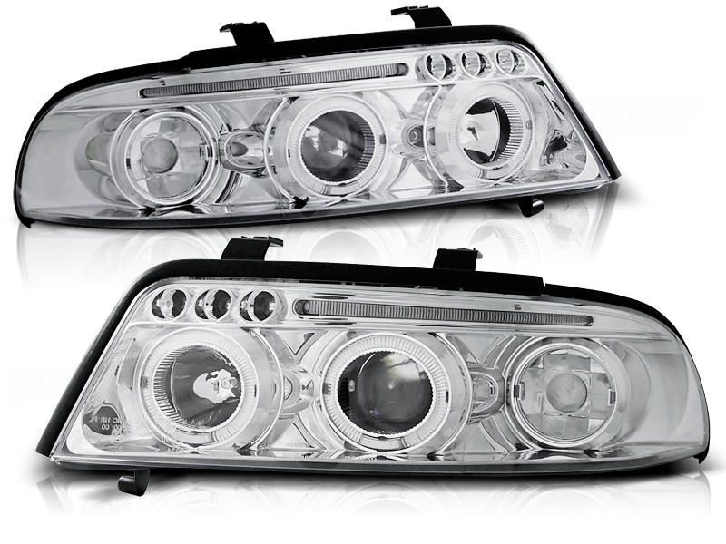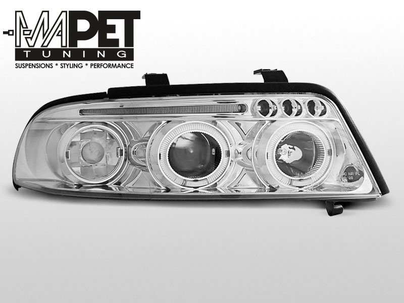 Lampy przednie do: Audi A4 B5 - CHROM clearglass Angel Eyes - przezroczyste soczewkowe + ringi