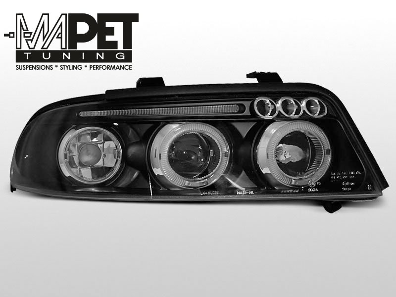 Lampy przednie do: Audi A4 B5 - BLACK clearglass Angel Eyes - przezroczyste czarne soczewkowe + ringi