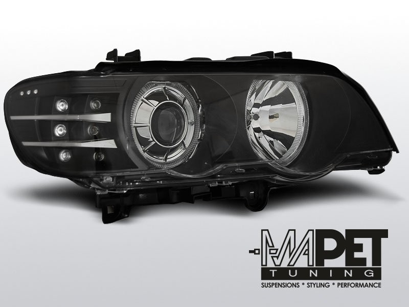 Lampy przednie do: BMW X5 E-53 - czarne Angel Eyes BLACK z soczewką + Ringi - Ksenonowe Xenon D2S _ kierunkowskaz diodowy LED