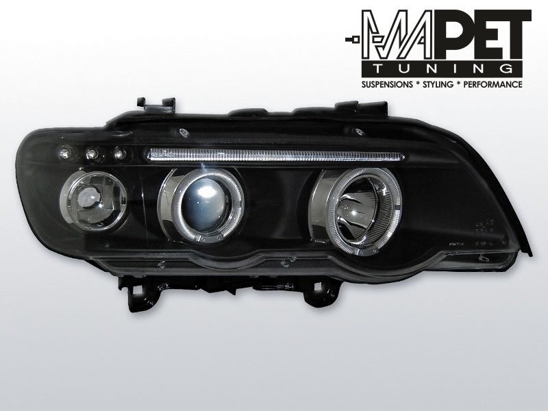 Lampy przednie do: BMW X5 E-53 - przezroczyste czarne Angel Eyes BLACK z soczewką + Ringi