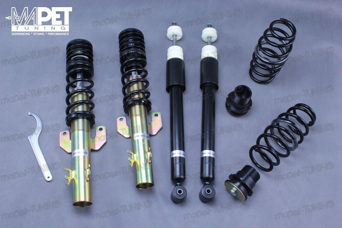 Regulacja wysokości w zależności od auta od 30mm do 80mm; bumps stops - zapobiegające dobijaniu amortyzatorów; certyfikat potwierdzający wysoką jakość - TUV; ocynkowana - antykorozyjna obudowa