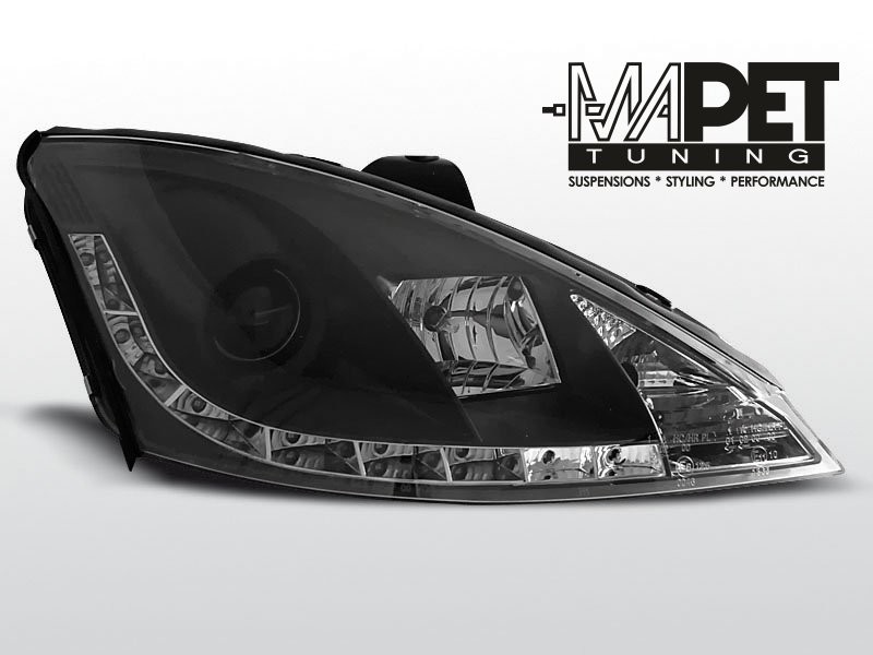 Lampy przednie do: Ford Focus I - BLACK LED - przezroczyste ciemne lampy z diodowymi świetlnymi paskami