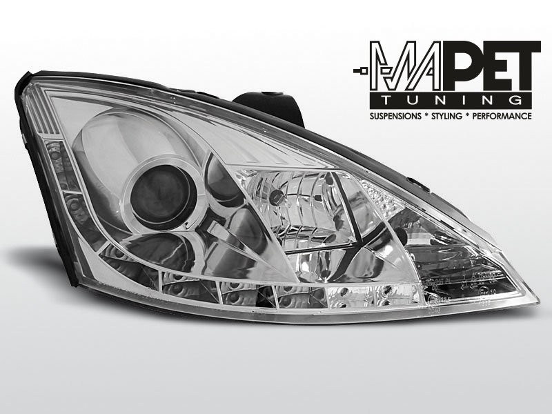 Lampy przednie do: Ford Focus I - CHROM LED - przezroczyste lampy z diodowymi świetlnymi paskami