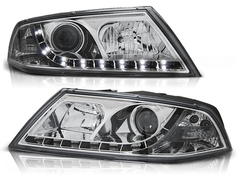 Lampy przednie do: Skoda Octavia 2 - CHROM Xenon D1S  - przezroczyste lampy z diodowymi świetlnymi paskami