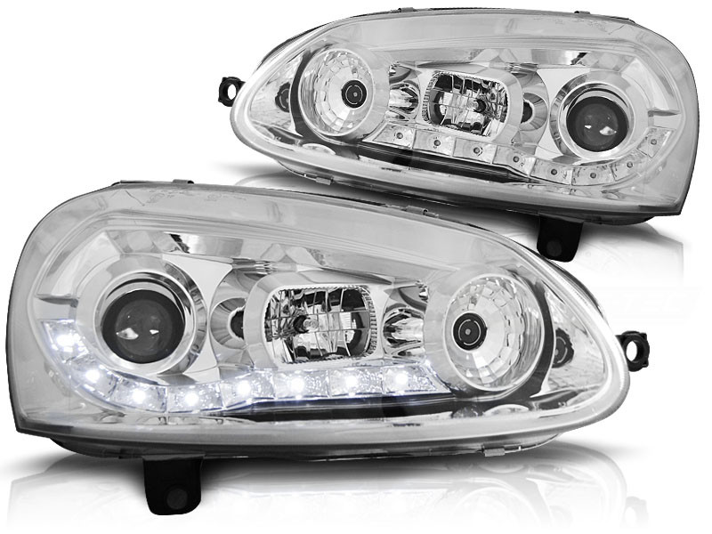 Lampy przednie do: VW Golf 5 / Jetta -  CHROM  - przezroczyste lampy z diodowymi świetlnymi paskami