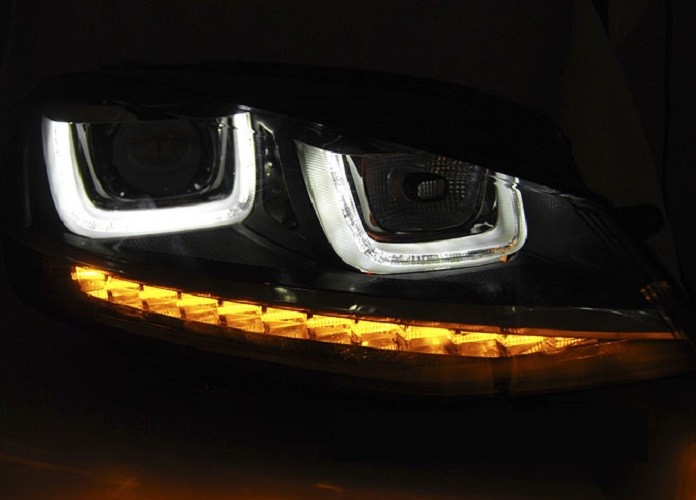 Lampy przednie do: VW GOLF VII - BLACK U-TYPE BLACK DRL ze światłami do jazdy dziennej LED oraz dynamicznym kierunkowskazem i doświetlaniem zakrętów