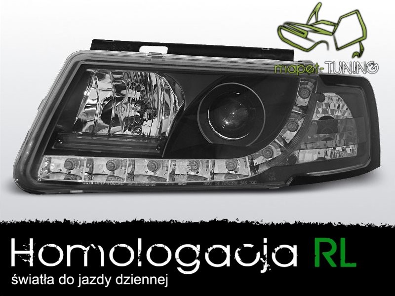 Lampy przednie do: VW Passat B5 - BLACK LED - przezroczyste ciemne lampy typu Daylight z diodowymi świetlnymi paskami z Homologacją do jazdy dziennej !!