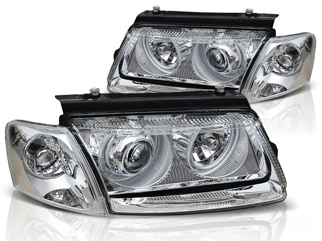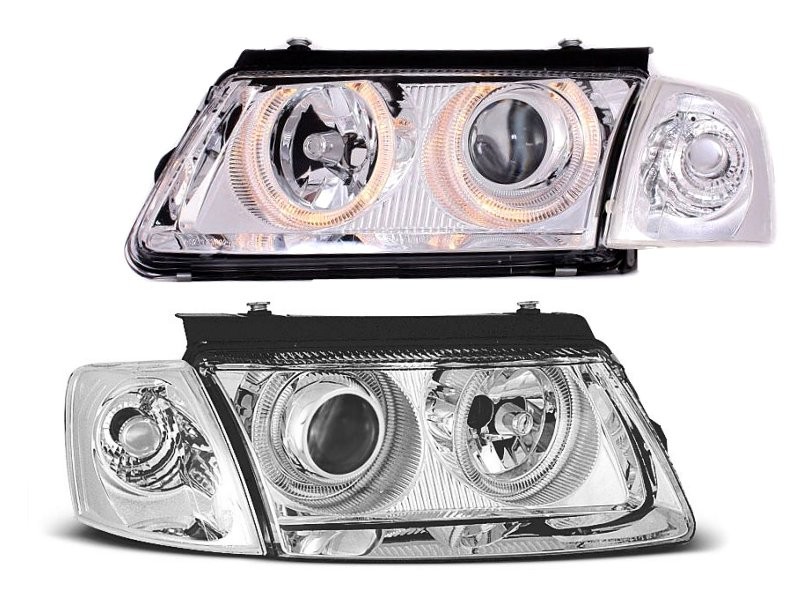 Lampy przednie do: VW Passat B5 (3B) Angel Eyes - przezroczyste z soczewkami i ringami + kierunkowskazy