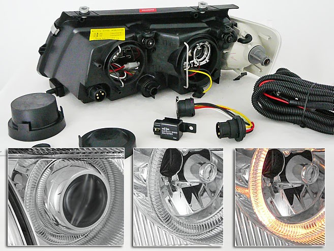 Nowoczesne przezroczyste reflektory typu Clear znanego producenta oświetlenia samochodowego. Posiadają świecące ringi i soczewki.