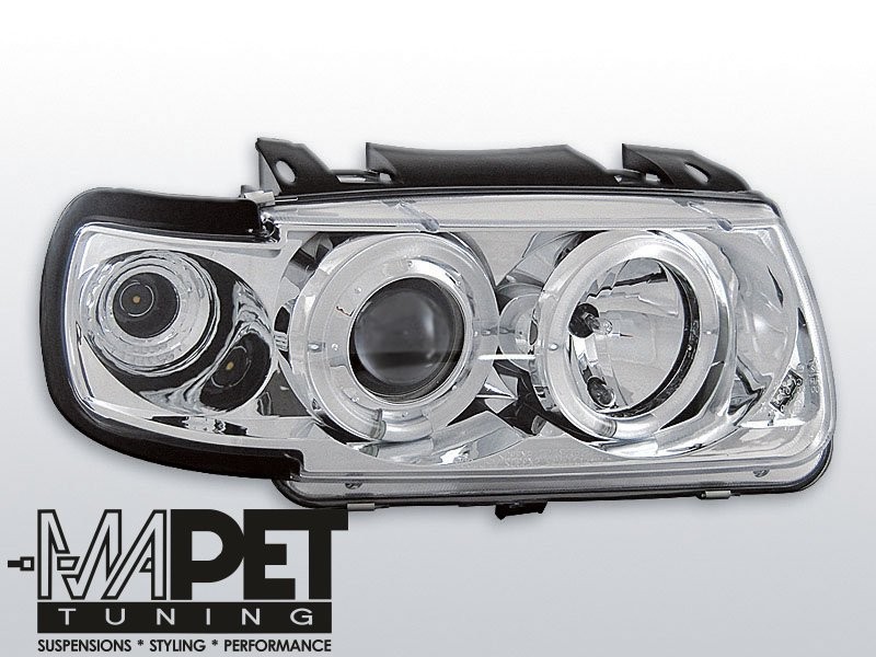 Lampy przednie do: VW Polo 6N - Angel Eyes CHROM - przezroczyste z soczewką + Ringi