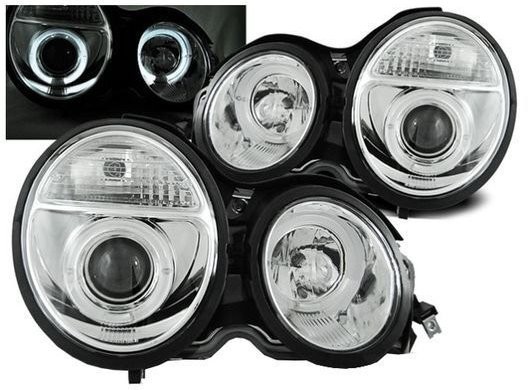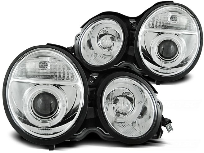 Lampy przednie do: Mercedes E-klasa W210 - Angel Eyes CHROM - przezroczyste z soczewką + ringi